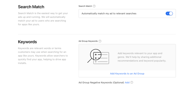 Additionally, each account should include a discovery campaign to increase the keyword pool. Apple Search Ads offers an automated Search Match feature to explore search terms used on the App Store.