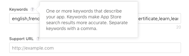 The keyword field allows developers to specify 100 characters for terms or phrases for which their app should appear in search results. Its main strength is its versatility: this is the place where the most critical generic keywords related to functionality will be placed.